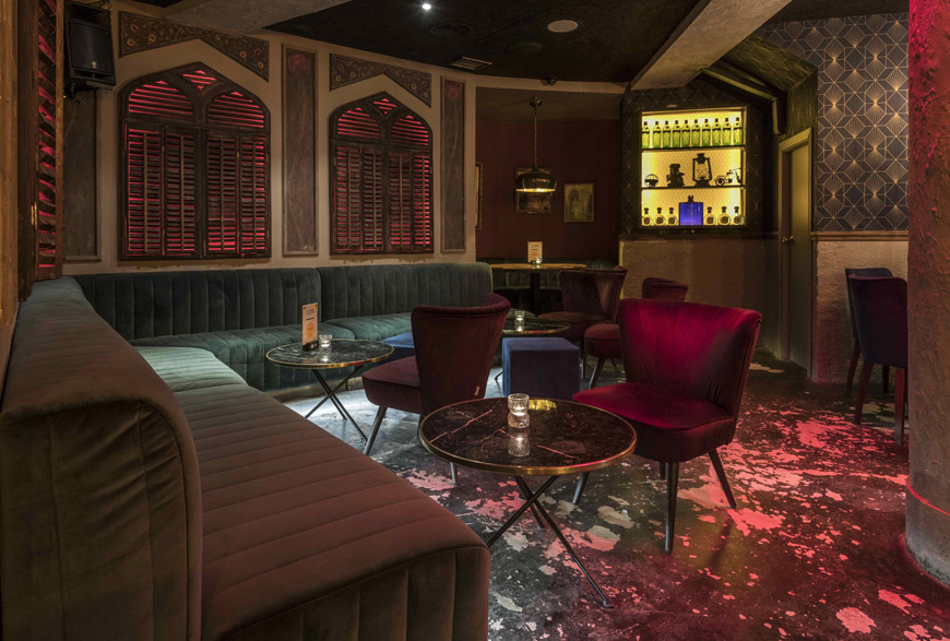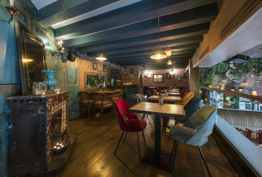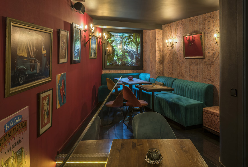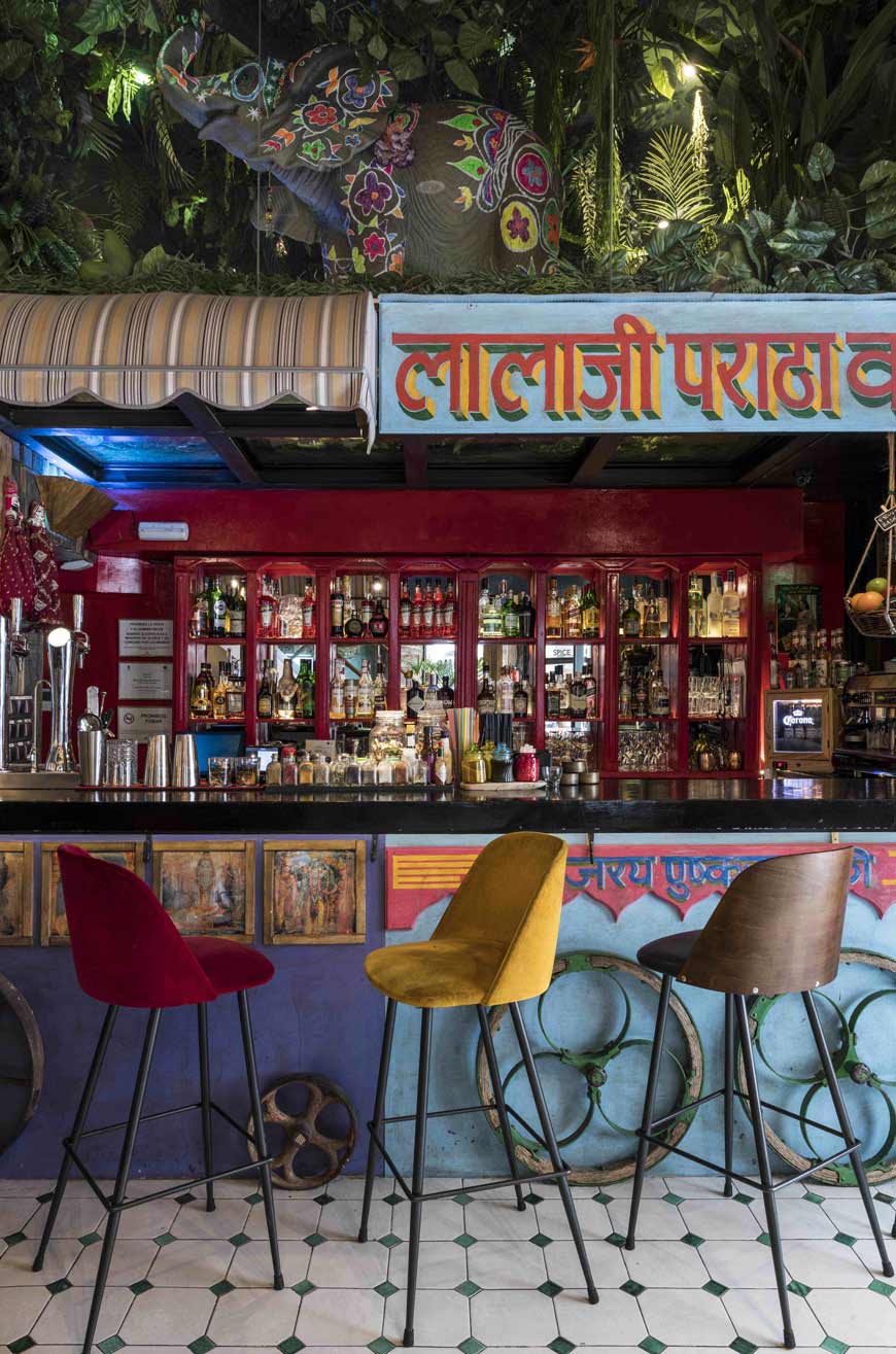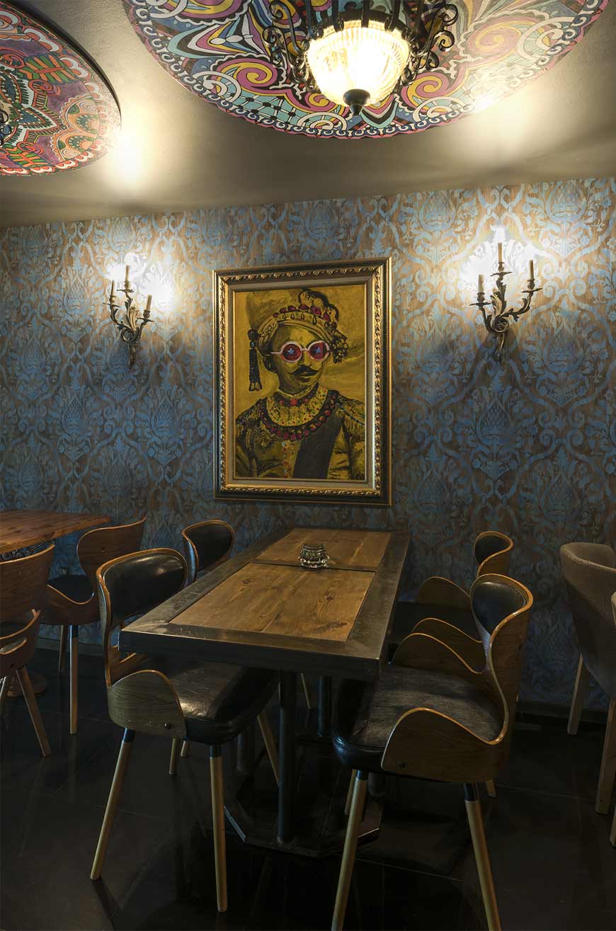 FOR THESE TWO RESTAURANTS THE CLIENT WAS LOOKING FOR AN ECLECTIC, COLOURFUL LOOK REMINISCENT OF THE LIFE IN INDIA. WE CREATED INCREDIBLY INTRICATE CUSTOM BARS, LAYERED COLOUR BY USING BOLD WALLPAPERS AS WELL VINTAGE LIGHTING. THE FINAL DESIGN RESULT IS A FEAST FOR THE SENSES.